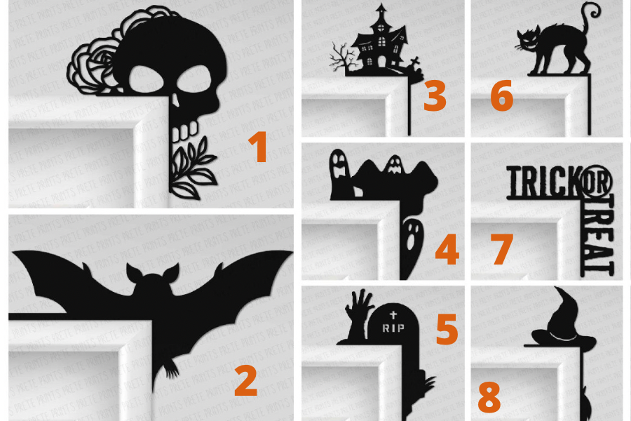 Add some Halloween fun to the tops of your doorways with these corner decorations.  Choose from 8 different designs. All of them will come painted black with the exception of the trick or treat which will come as pictured.  We can also leave them unpainted for a fun DIY project.